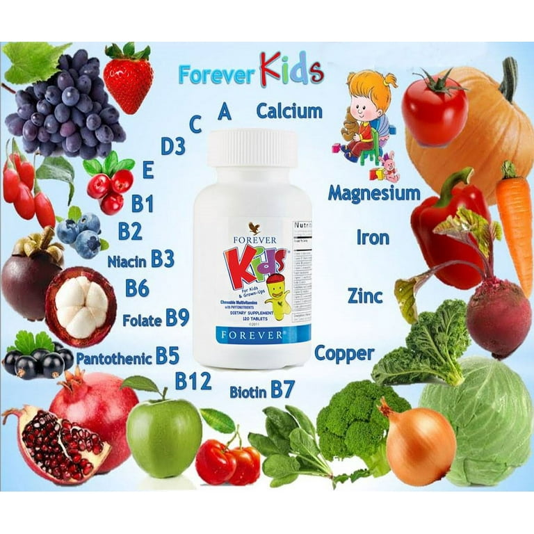 Doordeweeks naar school en het weekend gevuld met sporten, clubjes en partijtjes. Kinderen zijn maar druk! Het multivitamine supplement Forever Kids bestaat uit kauwtabletten die kinderen de voedingsstoffen geven die ze elke dag nodig hebben. Met de heerlijke, zoete smaak van druiven - het lijken wel snoepjes! Forever Kids bevat geen kunstmatige kleurstoffen of conserveermiddelen.